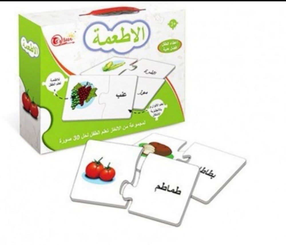 - اطلب من الطفل مطابقة القطع لربط صورة الطعام بـ اسمه العربي.