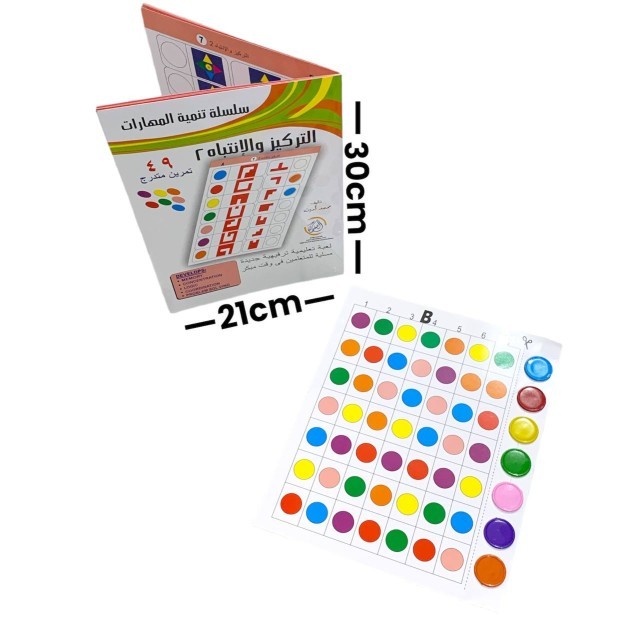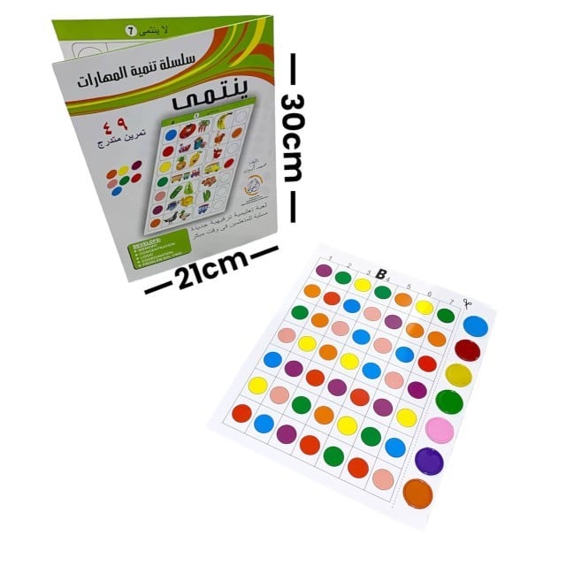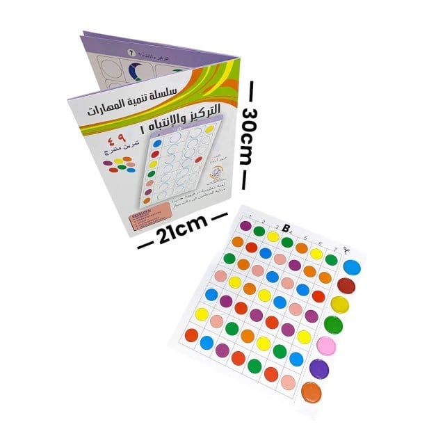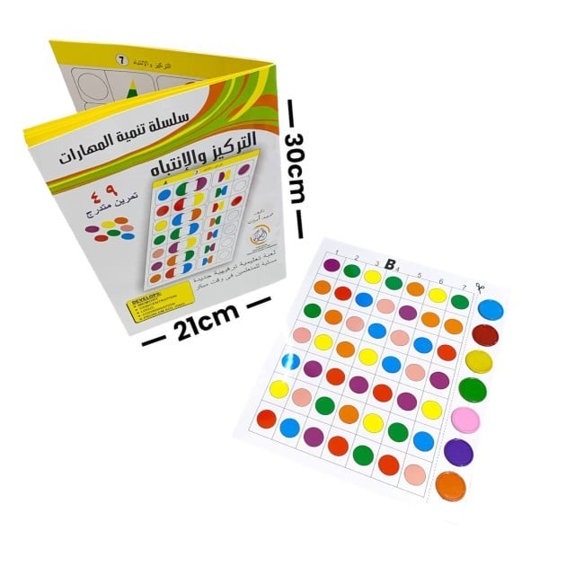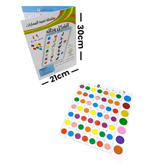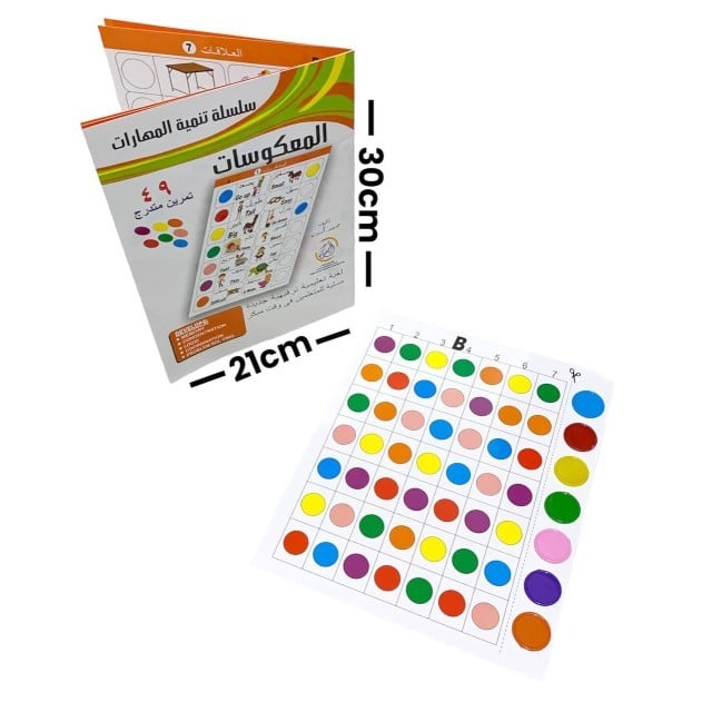 - عدد القطع: 6 كتب، 7 قطع بلاستيكية (دوائر ملونة بقطر 3 سم)