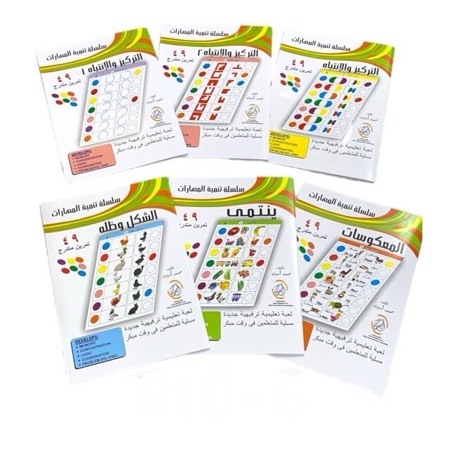 كتب تنمية مهارات عبارة عن سلسلة تعليمية مكونة من 6 كتب مع دوائر ملونة، مصممة لتعزيز التركيز، الذاكرة، والتفكير المنطقي من خلال تمارين تفاعلية ممتعة.
